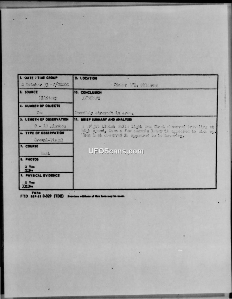 Report on an Unidentified Object in Flight — Tinker AFB, Oklahoma, 2 October 1953