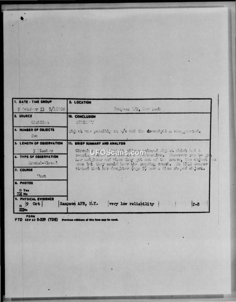Unidentified Flying Objects - Sampson Air Force Base, New York - 9 October 1953