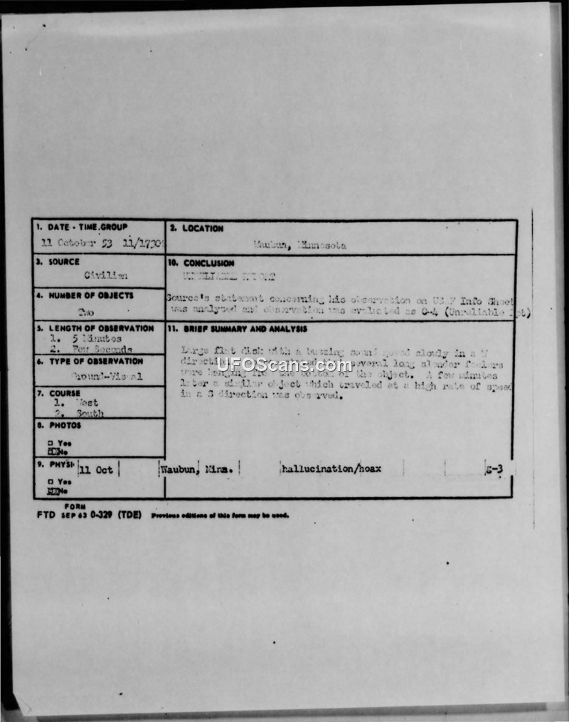 A farmer in Waubun, Minnesota, reported observing two unidentified objects on October 11, 1953. The military evaluated the report as C-4 (unreliable) and determined no further investigation was required.