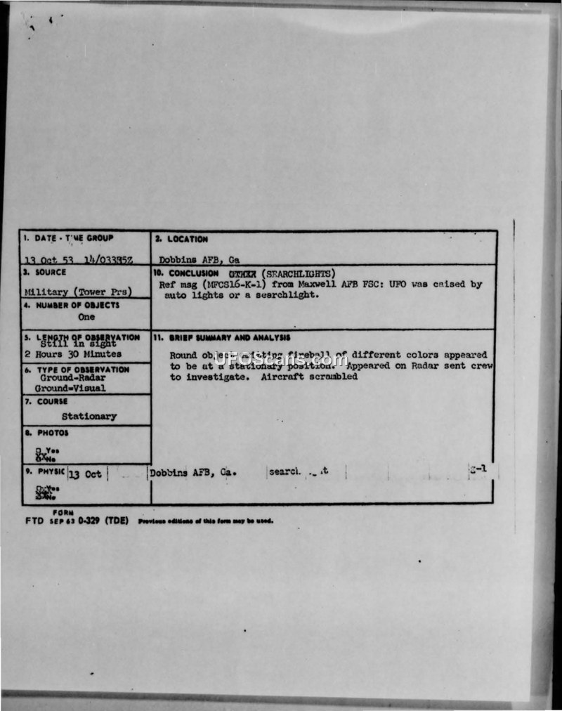 UFO Sighting Report — Dobbins AFB, Georgia, October 13, 1953
