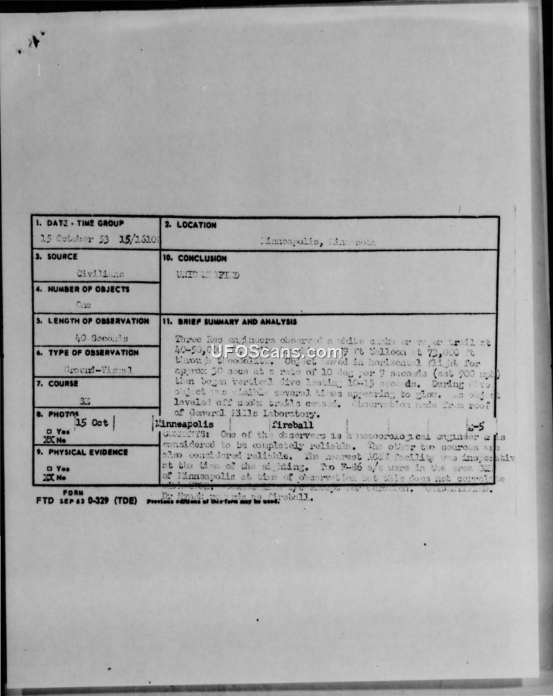Sighting of Unidentified Object — Minneapolis, Minnesota, October 15, 1953
