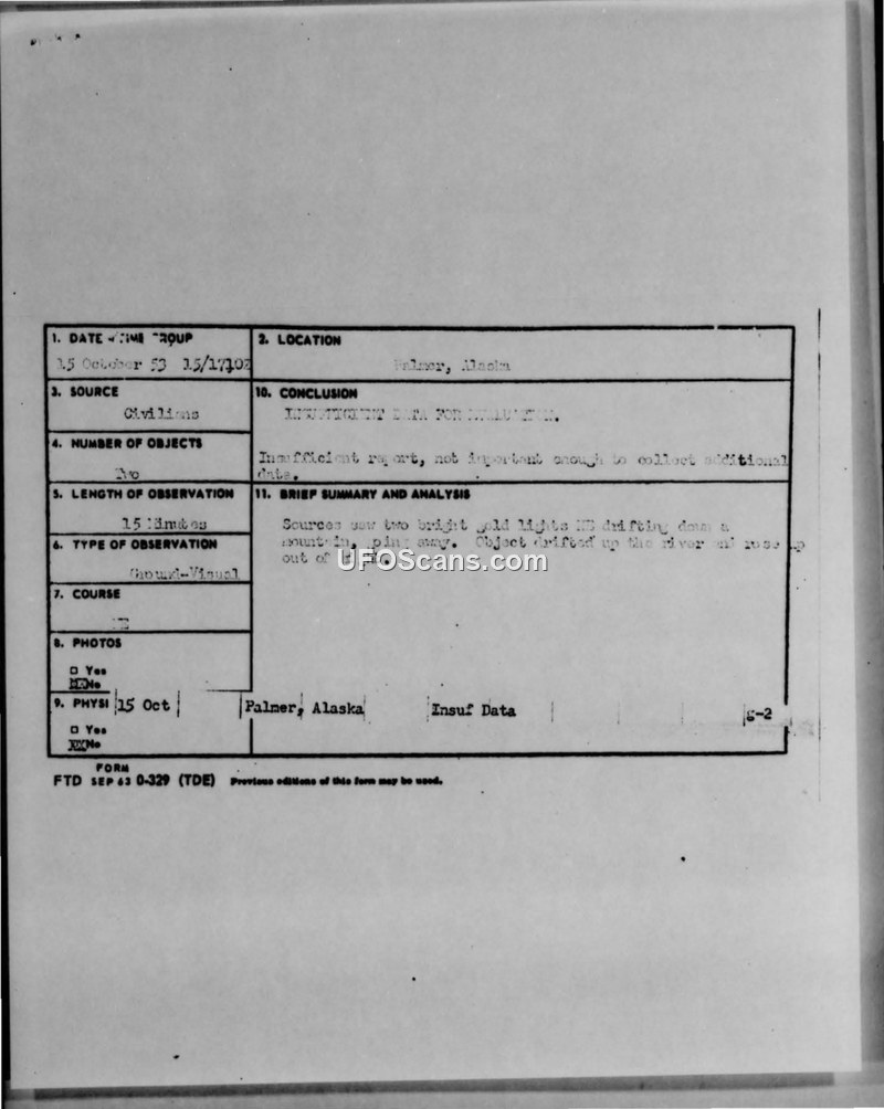 A 1953 military field report documenting a civilian sighting of two unidentified gold lights near Palmer, Alaska. The military concluded the report contained insufficient data for further investigation.