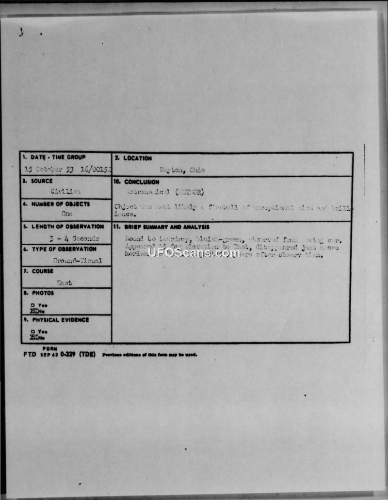 A 1953 sighting report from an Aero Research Engineer describing a bluish-green, teardrop-shaped object observed in Dayton, Ohio. The Air Force concluded the object was likely a fireball.
