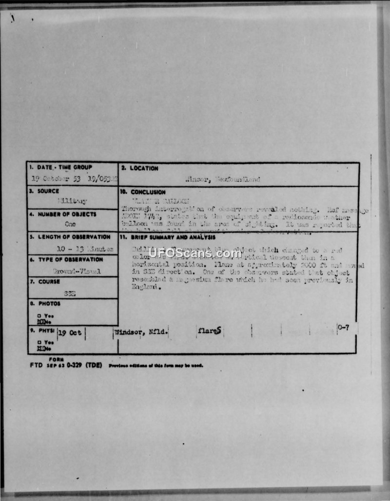 A sighting of a brilliant blue object in Windsor, Newfoundland, on 19 October 1953 was investigated by the USAF and RCMP. The object was officially identified as a recovered radiosonde weather balloon.