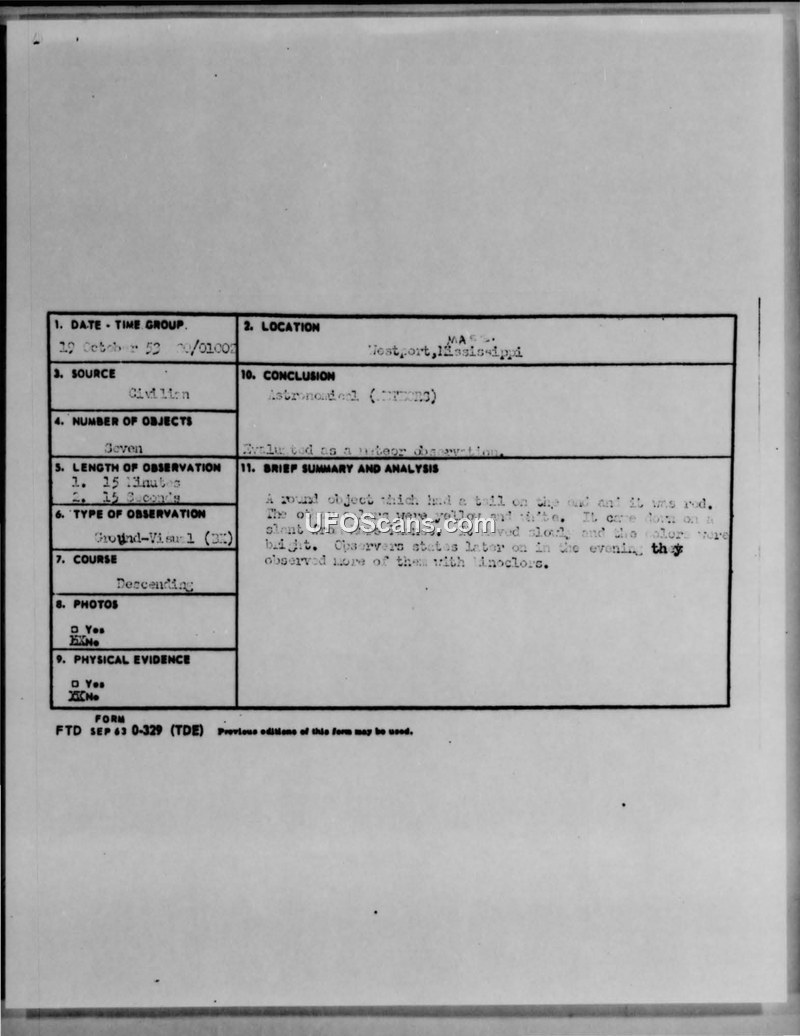 A 1953 sighting report from Westport, Massachusetts, describing seven slow-moving, metallic, multi-colored objects. The U.S. Air Force officially evaluated the incident as a meteor observation.