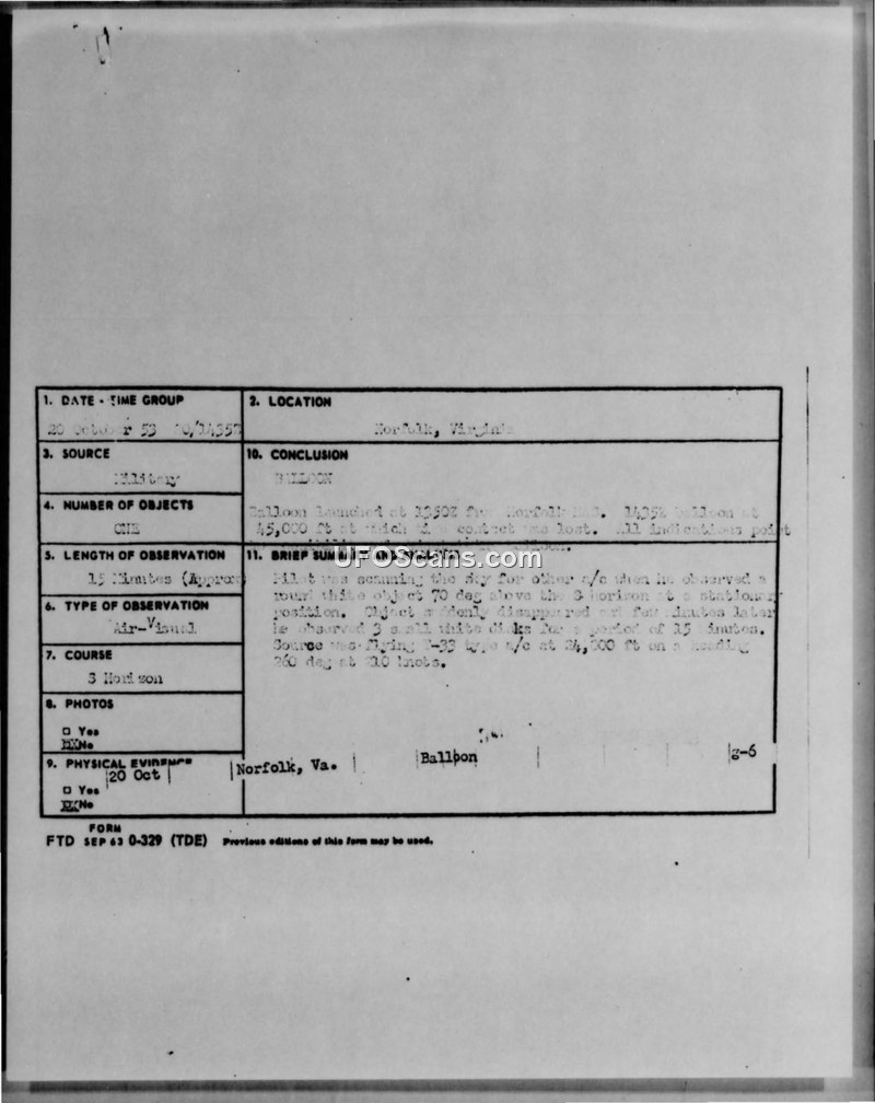 A pilot reported three white disks near Norfolk, Virginia, on October 20, 1953. Military intelligence concluded the objects were a weather balloon released from a nearby naval station.
