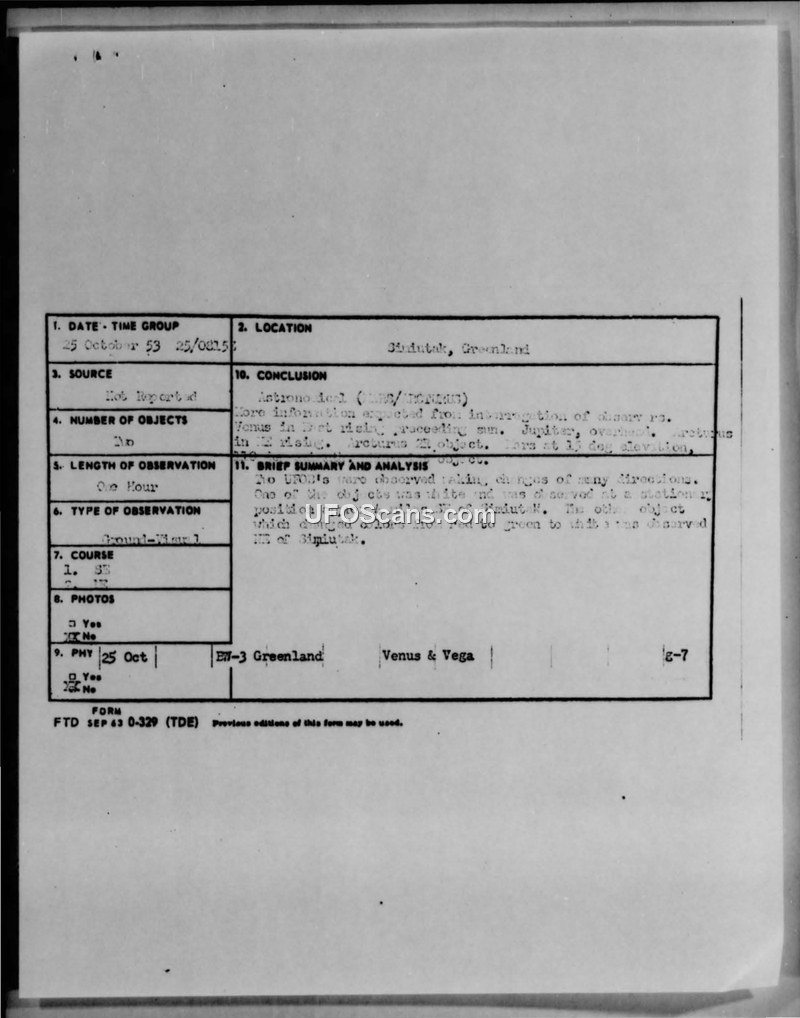 Military cables from October 1953 report a sighting of two glowing objects over Simiutak, Greenland. The Air Technical Intelligence Center subsequently identified the objects as the stars/planets Venus and Vega.