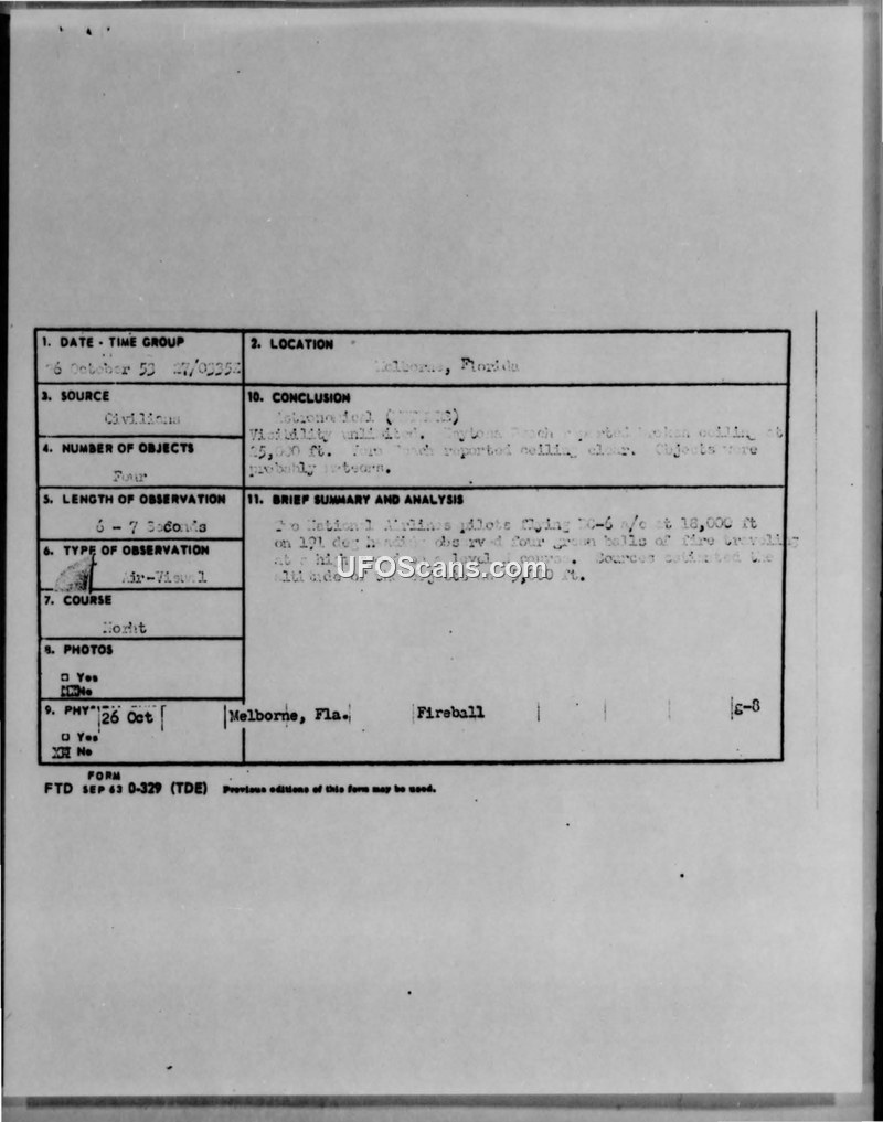 National Airlines flight crew reported a large green fireball followed by three smaller objects over Florida on October 26, 1953. The incident was officially attributed to meteors despite the detailed visual account.