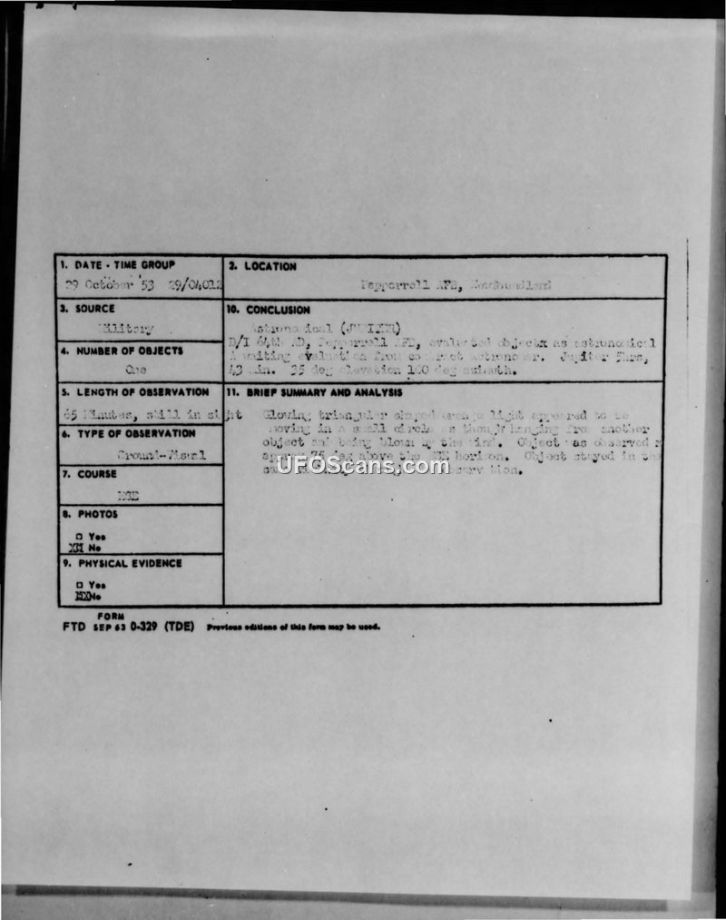 Sighting Report — Pepperrell AFB, Newfoundland, 29 October 1953