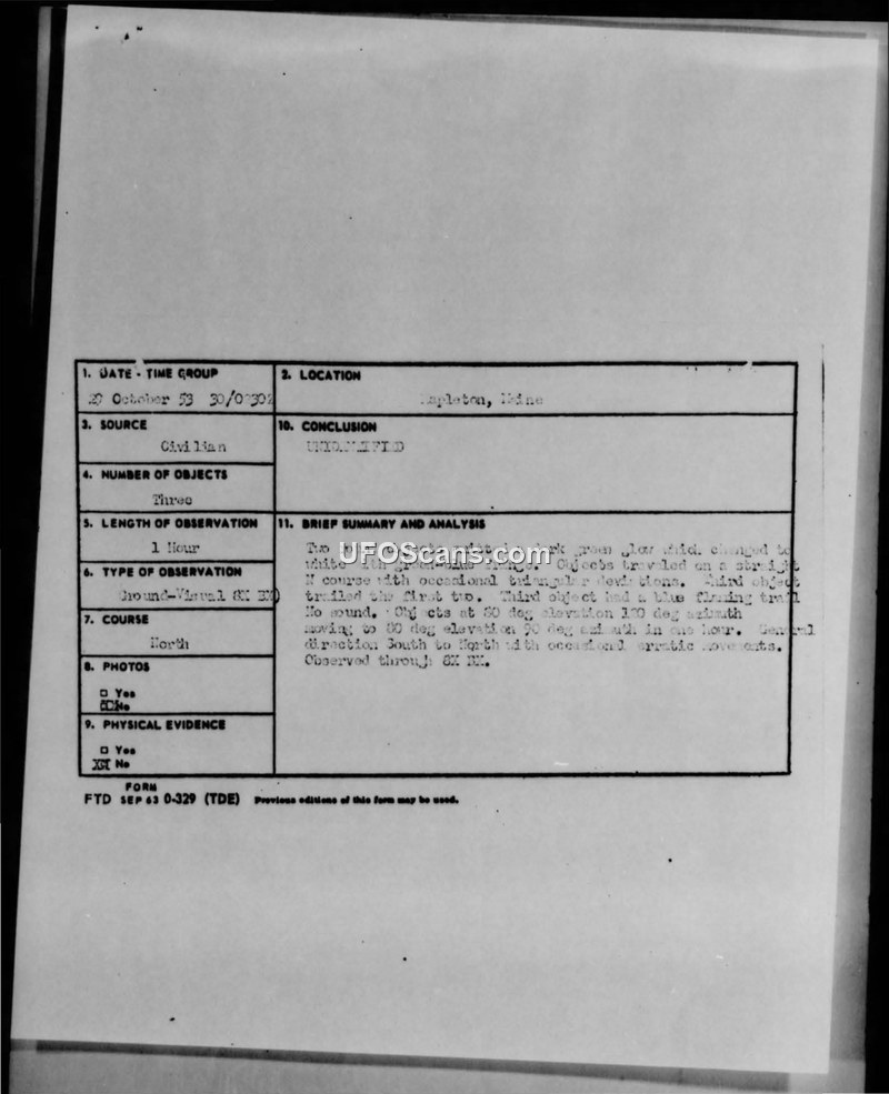 A report of three unidentified objects observed over Mapleton, Maine, on October 20, 1953. The objects displayed unusual colors and movement patterns, and the official investigation concluded the cause was undetermined.