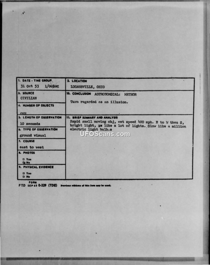 A 1953 U.S. Air Force report documenting a sighting of a glowing, saucer-like object in Logansville, Ohio. The Air Force officially classified the event as a meteor and an illusion.