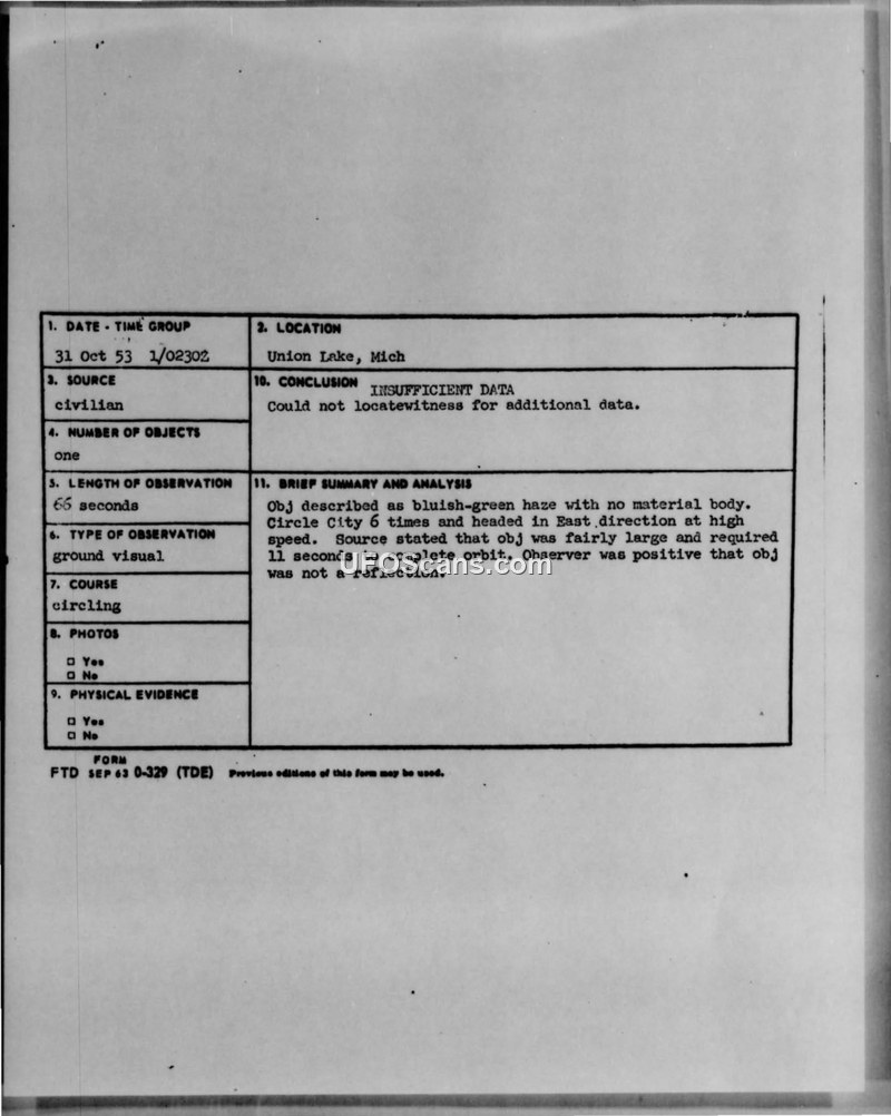 Unidentified Aerial Phenomena Sighting Report — Union Lake, Michigan, 31 October 1953