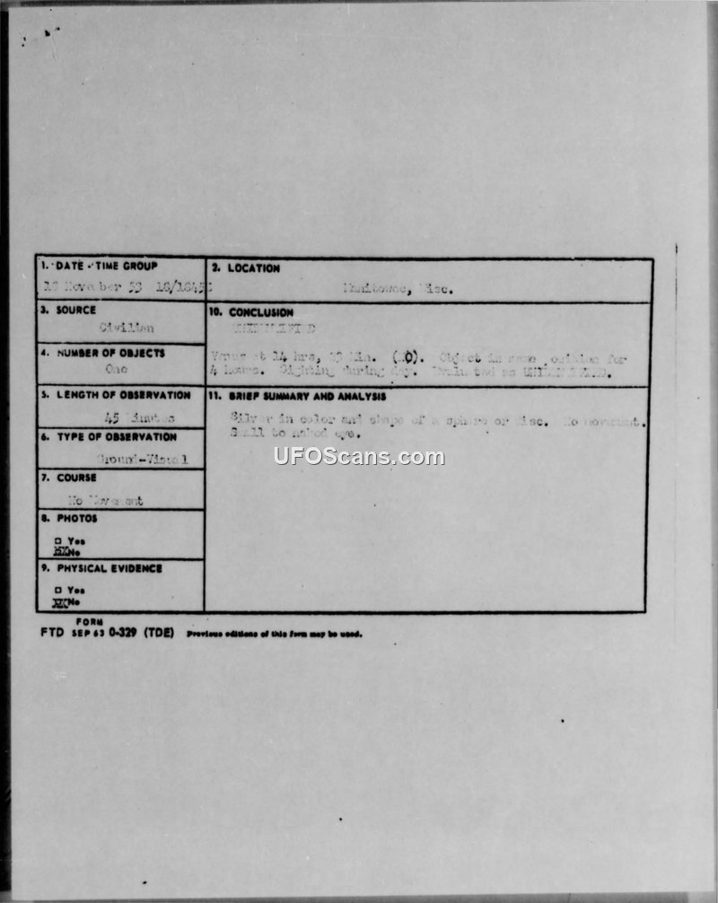 A Civil Air Patrol Major reported a stationary, silver, spherical object in the sky over Manitowoc, Wisconsin, for over four hours on November 18, 1953. The report was evaluated by Project Sign and officially classified as unidentified.