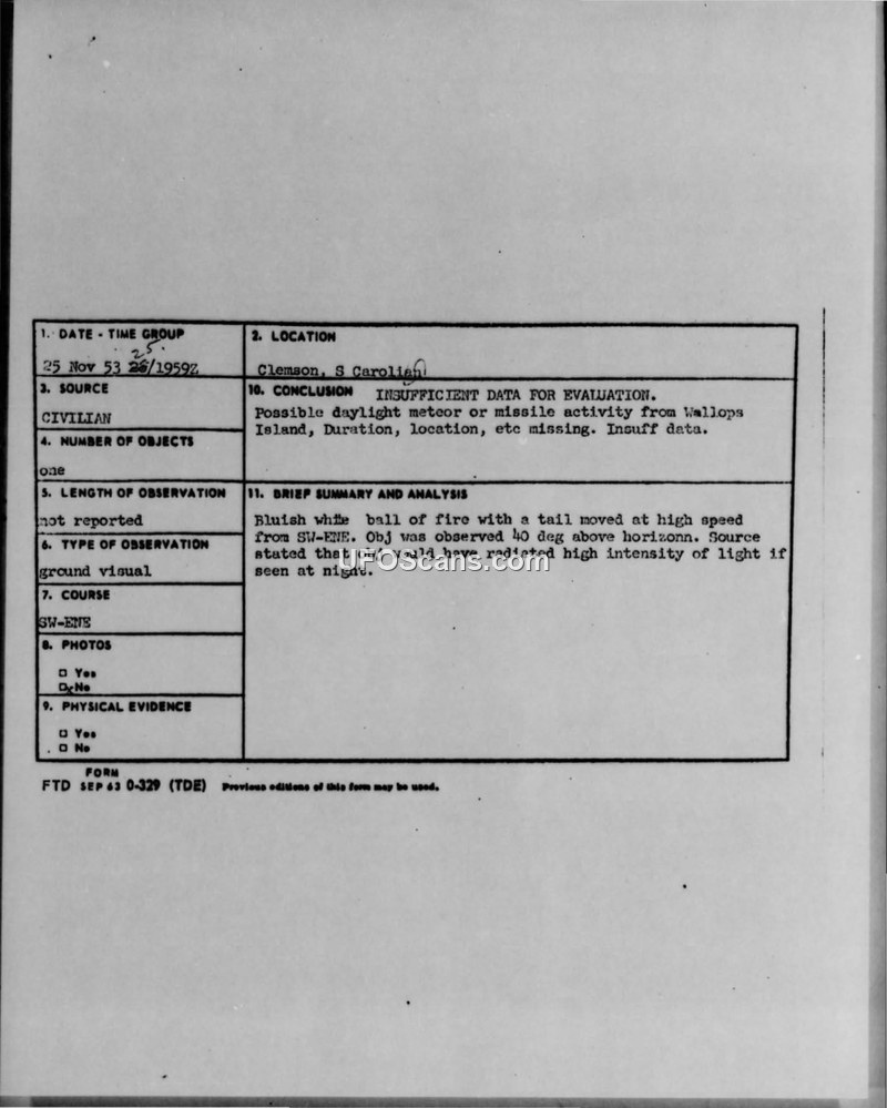 A civilian in Clemson, SC, reported a bluish-white fireball with a tail on November 25, 1953. Military authorities concluded there was insufficient data, suggesting it was likely a meteor or missile activity.