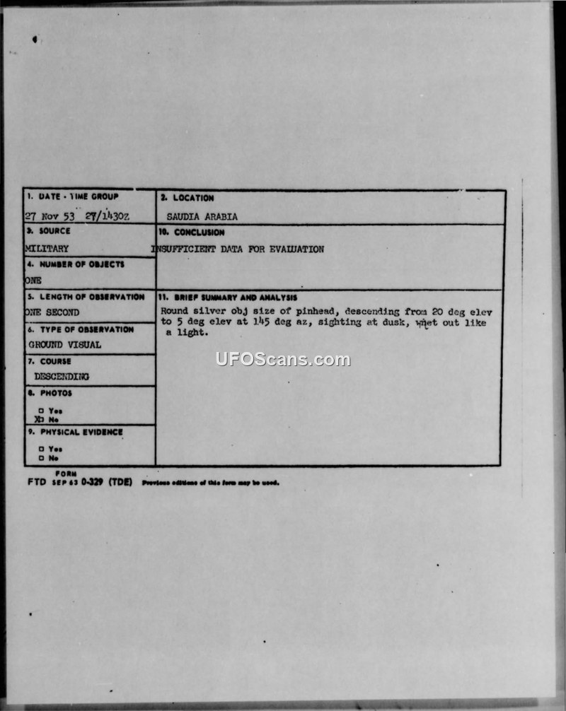 Military reports from November 1953 describe a short-duration sighting of a silver, spinning object over Dhahran Airfield, Saudi Arabia. The incident was officially concluded to be a meteor.
