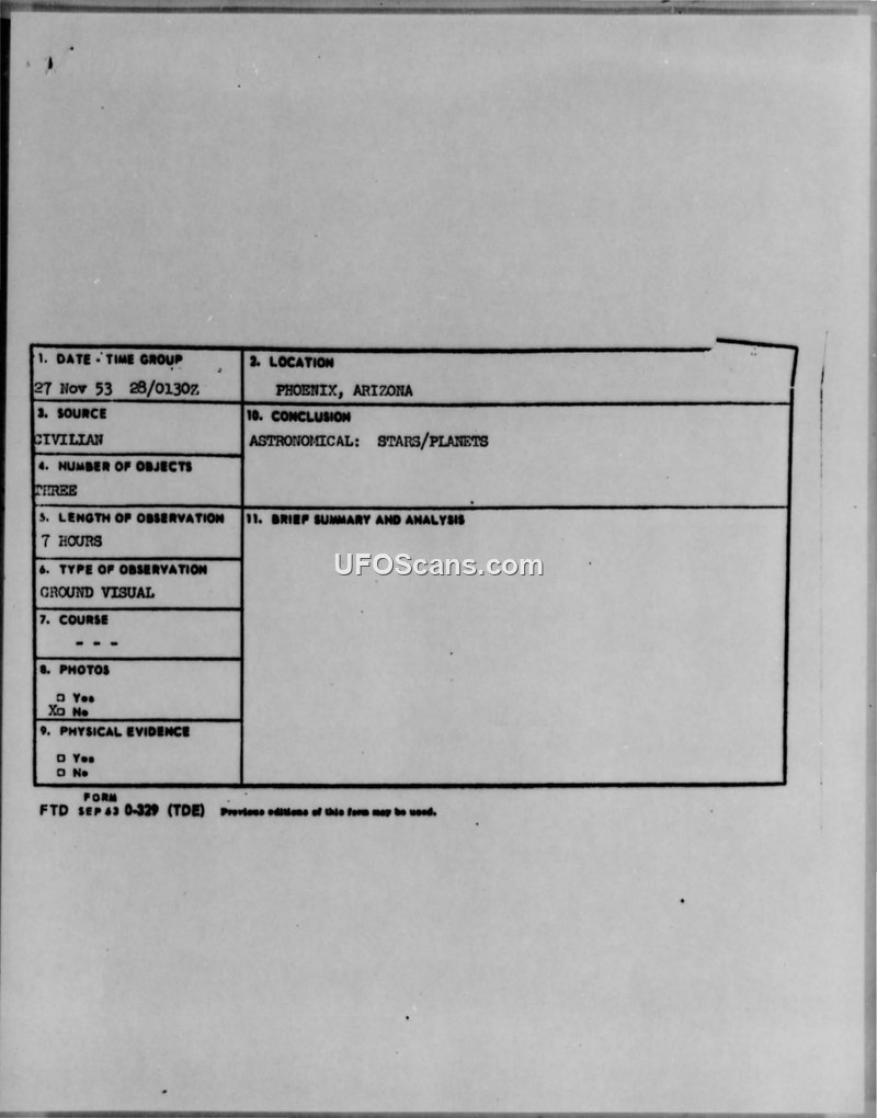 A 1953 military report details a seven-hour sighting of three unidentified objects over Phoenix, Arizona. The Air Force officially concluded the objects were stars or planets.