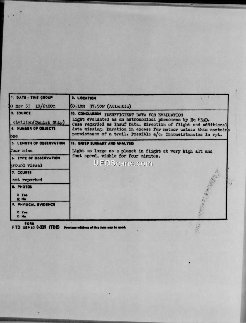 A Danish ship reported a high-altitude, fast-moving light in the Atlantic on November 10, 1953. The US Air Force evaluated the report as insufficient data, suggesting it was likely an astronomical phenomenon or an aircraft.