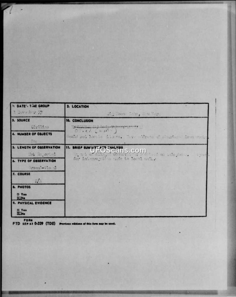 A reported UFO sighting at Big Moose Lake in 1953 was investigated by the 4602nd AISS. The case was officially closed as a hoax after investigators discovered the witnesses provided a fictitious address.