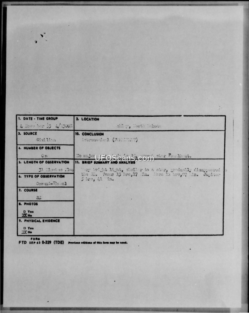 A 1953 sighting of a bright, star-like object in Ashley, North Dakota, was investigated by the Air Technical Intelligence Center. The object was officially identified as the star Fomalhaut.