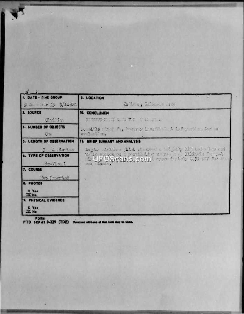 On November 5, 1953, at approximately 0440 hours, a pilot flying a Regina Airlines DC3 (N28392) reported an encounter with an unidentified aerial object over Illinois. The pilot described the object as being brightly lighted with amber and white colors. The object maintained a course that paralleled the aircraft for a duration of three to four minutes before disappearing as the aircraft passed over Illinois. The object subsequently reappeared at approximately 0450 hours for about one minute, during which time the pilot observed the bright white light turn green before it vanished. The report was transmitted via the Lowry Flight Service Center to various military intelligence and command units, including the Air Technical Intelligence center at Wright-Patterson AFB. The official conclusion reached by the evaluating authorities was that there was insufficient data to conduct a formal evaluation, noting that while it was possibly an aircraft, the available information was inadequate for a definitive assessment.