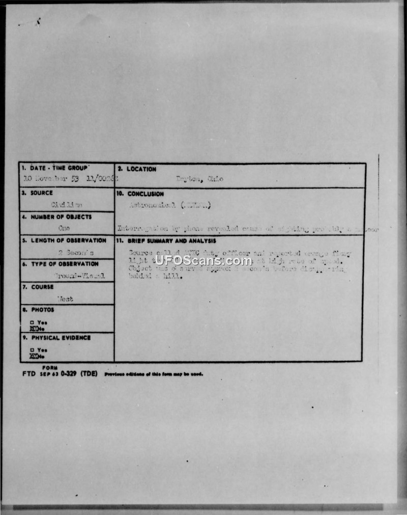 This document contains a collection of reports and technical information sheets regarding unidentified aerial phenomena. The primary report details a sighting on November 10, 1953, in Dayton, Ohio. A witness, while driving across the West Third Street Bridge, observed a single, orange, fiery object with constant brightness traveling west at a high rate of speed. The observation lasted approximately two seconds before the object disappeared behind a hill. The official conclusion, recorded by an investigator named Fitch, identified the object as a meteor. The document also includes a newsletter from the Civilian Saucer Intelligence (CSI) group, which discusses a separate incident involving Mrs. Ethel Coleman of Lebanon, Ohio. On November 14, 1953, Mrs. Coleman captured images of a small, round, milk-glass object resembling a moon on film while attempting to photograph Mercury during an eclipse. The newsletter details the analysis of this film by various individuals, including Herbert Clark and Ken Hock, and presents a hypothesis that the object was a material, non-metal device operating under remote control. Finally, the document includes a Hydrographic Bulletin report from November 11, 1953, regarding a comet sighting in the North Pacific by Mr. Antonio G. Pista aboard the SS. President Fillmore. The report describes a dark blue comet that illuminated the sky and sea, leaving a trail that glowed for five minutes.