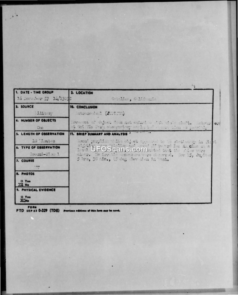 A military report detailing a 1953 UFO sighting in California that was officially attributed to the planet Jupiter by astronomers. The witness was a T/Sgt with aviation experience.