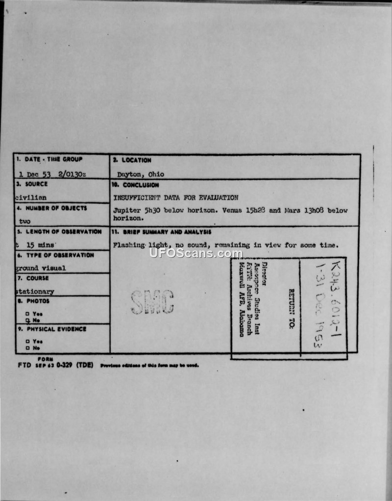A civilian reported two flashing, silent objects in Dayton, Ohio, on December 1, 1953. The Air Force concluded there was insufficient data for evaluation, noting the positions of major planets below the horizon.