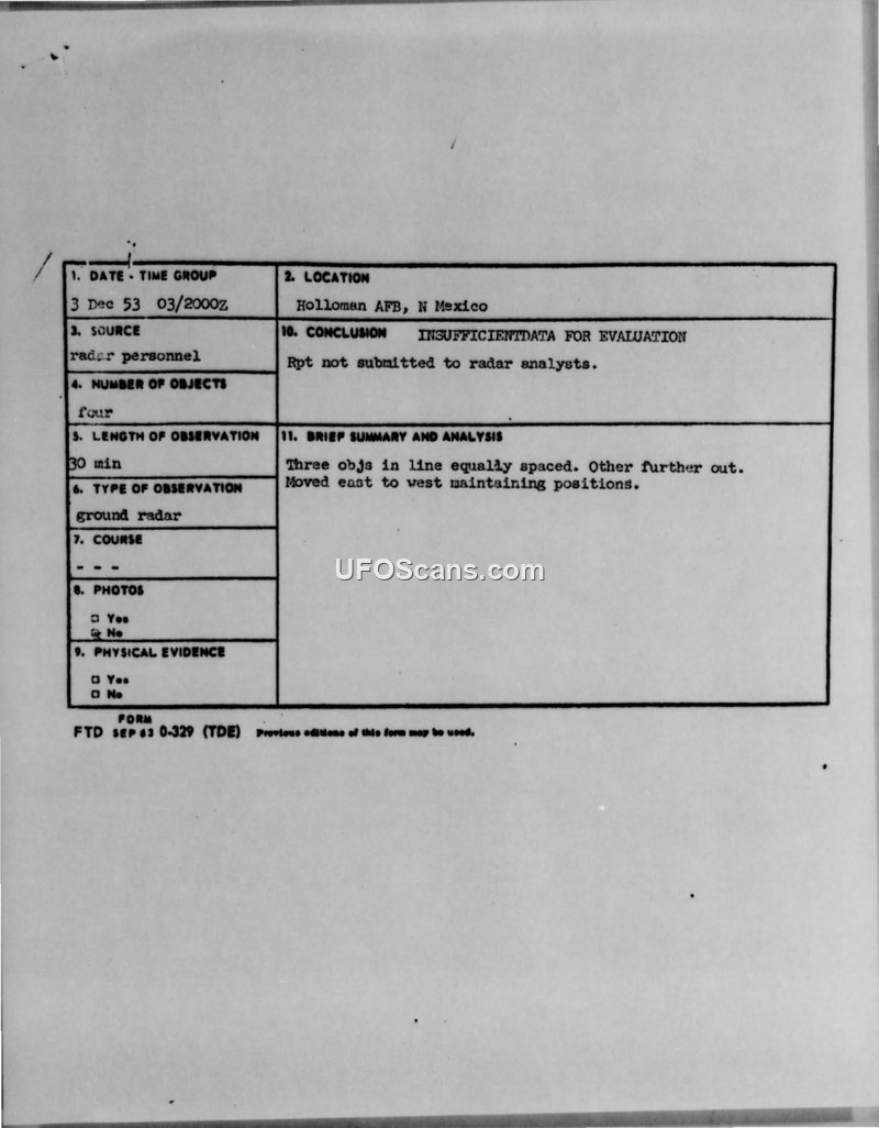 A 1953 radar sighting report from Holloman AFB describes four unidentified objects moving in formation. The incident was officially classified as having insufficient data for evaluation.