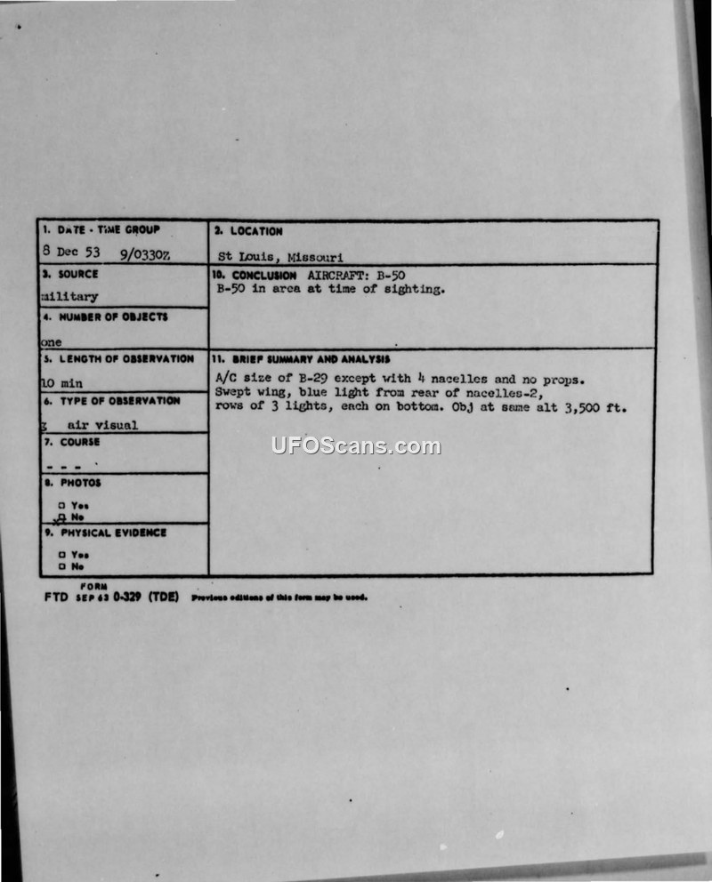 A B-26 crew reported an unidentified object near St. Louis on December 8, 1953, which caused radio interference. Military intelligence concluded the object was a B-50 aircraft.