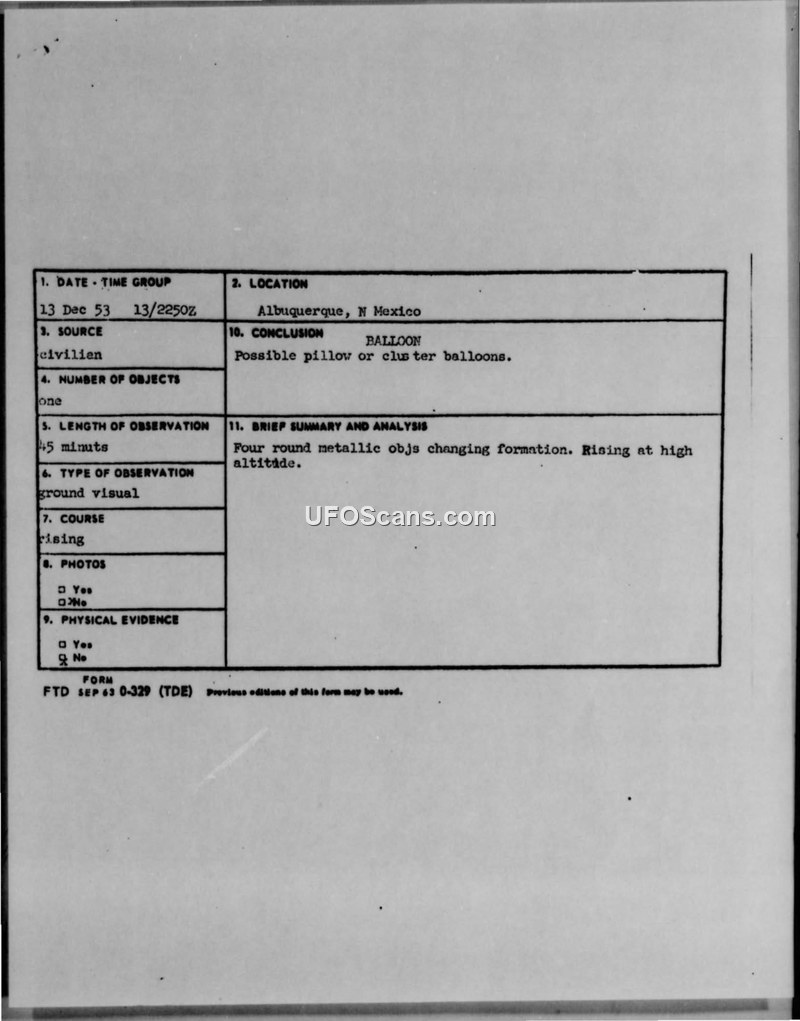 A 1953 USAF sighting report from Albuquerque, New Mexico, describes four metallic objects observed by a civilian. The military concluded the objects were likely balloons, though noted the data was insufficient for a full evaluation.
