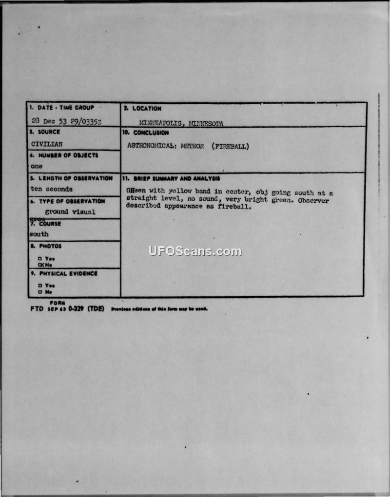A 1953 sighting report from Minneapolis describes a green fireball-like object moving south. The official military conclusion classified the event as an astronomical meteor.