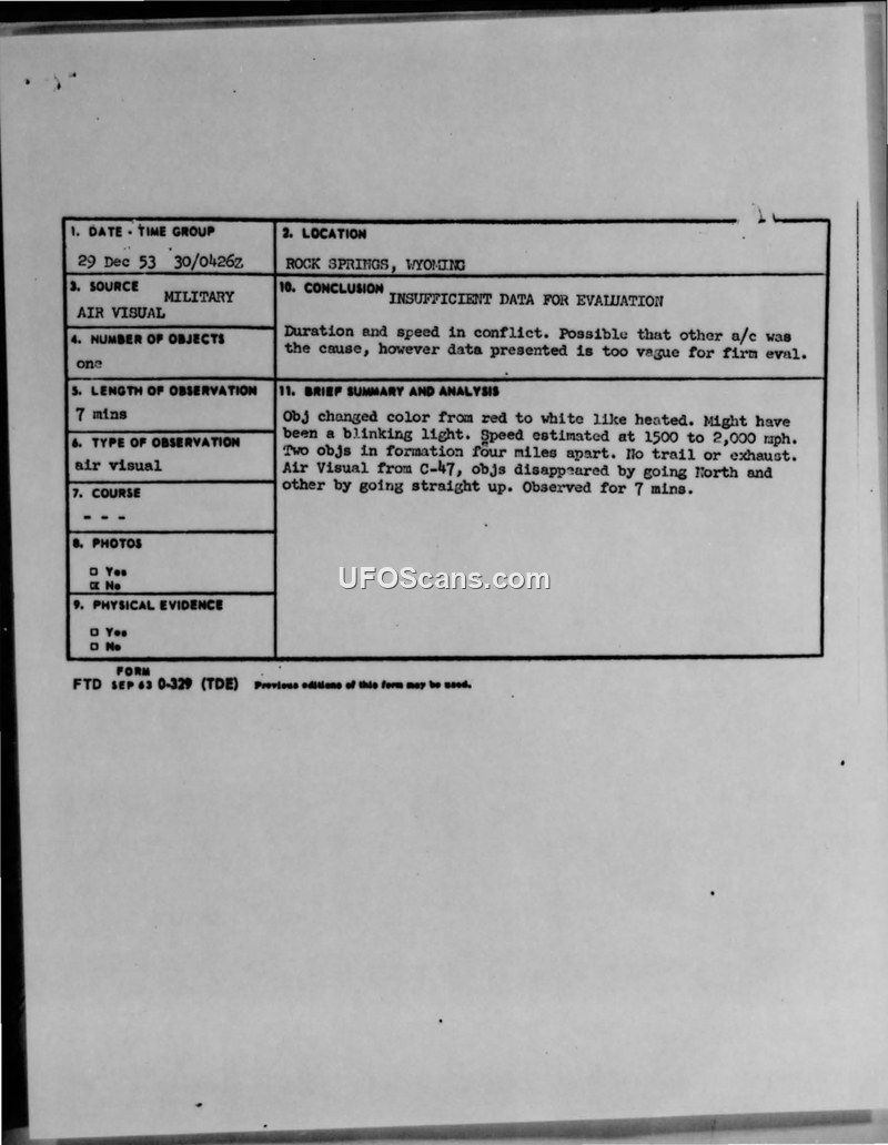 A C-47 aircrew reported two high-speed objects near Rock Springs, Wyoming, on December 29, 1953. The objects exhibited rapid color changes and high-speed maneuvers, but the military evaluation deemed the data insufficient for a firm conclusion.