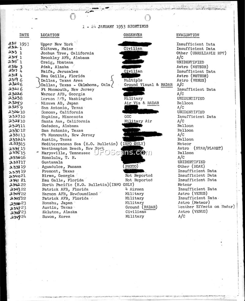 Sightings Reports: January – December 1953