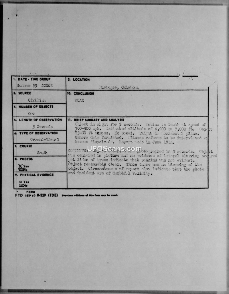 A 1953 sighting of an object in Muskogee, Oklahoma, was reported by a postal employee who provided a photograph. The Air Force investigation concluded the incident was a hoax.