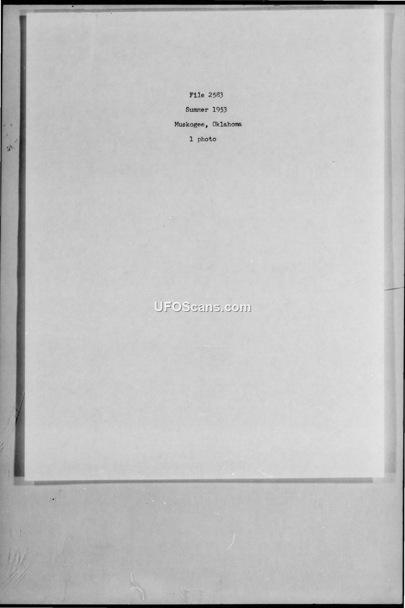 This document, identified as File 2583, serves as a brief record of a sighting incident that occurred in Muskogee, Oklahoma, during the summer of 1953. The file contains minimal textual information, consisting only of the location, the timeframe, and a reference to a single photograph. The second page of the document provides the photographic evidence, which depicts an unidentified object in the sky above a cloud formation. No further details regarding the nature of the object, the identity of the witness, or any official investigation findings are provided within the document.