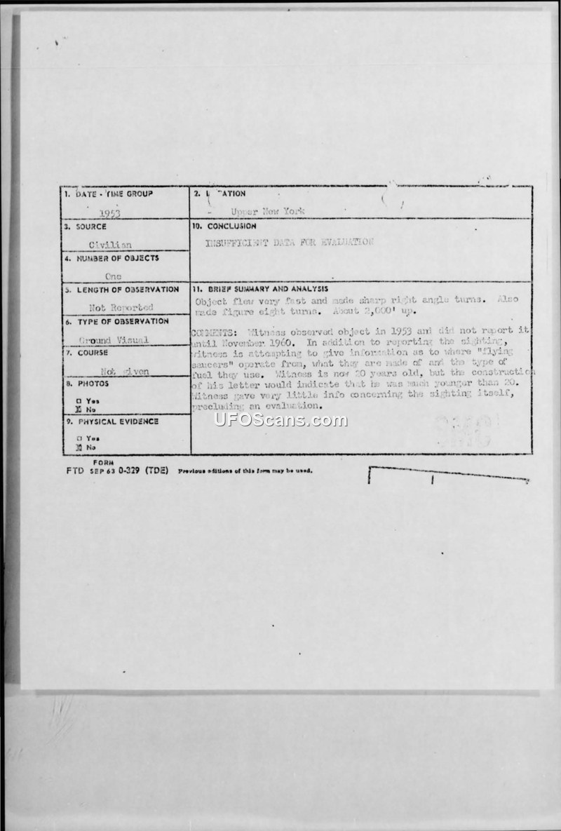 A 1960 report regarding a 1953 sighting of an unidentified object by a Boy Scout in New York. The case was closed as having insufficient data for evaluation due to the long delay in reporting and the speculative nature of the witness's account.