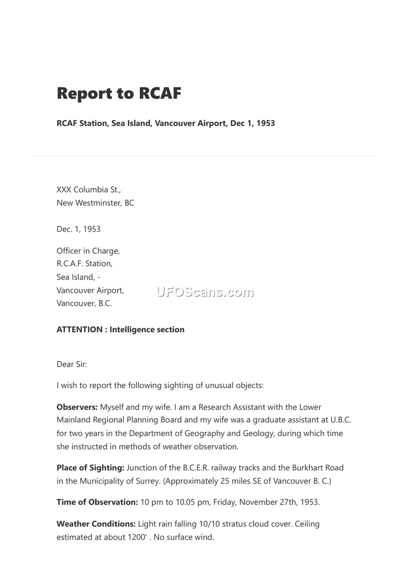 On December 1, 1953, a report was submitted to the RCAF Station at Sea Island, Vancouver Airport, regarding a sighting of seven unidentified objects on the night of November 27, 1953. The observers, a research assistant with the Lower Mainland Regional Planning Board and his wife, a former graduate assistant in geography and geology at the University of British Columbia, were located at the junction of the B.C.E.R. railway tracks and Burkhart Road in the Municipality of Surrey, British Columbia. Between 10:00 pm and 10:05 pm, the witnesses observed seven objects in the eastern sky, spread over approximately 120 degrees. Six of the objects appeared as bright lights behind a heavy bank of clouds, while the seventh was lower and more distinct. This seventh object was described as a circular, brilliant silver disc emitting a bright blue-white light. The witnesses noted that the object appeared to be at the base of the cloud cover, with wisps of cloud passing over it, creating a halo effect. The objects remained stationary relative to the ground, exhibiting only vertical movement, and produced no sound. One object was observed to descend and brighten as it neared the ground. The witnesses checked with the Weather Bureau and were informed that weather balloons are not released during rain. The RCAF investigation, documented by Flying Officer H.B. Taylor, confirmed that no aircraft were in the vicinity and that no weather balloons had been released. The military concluded that the objects were not aircraft, and no further identification or interception action was taken due to the delay in receiving the report.