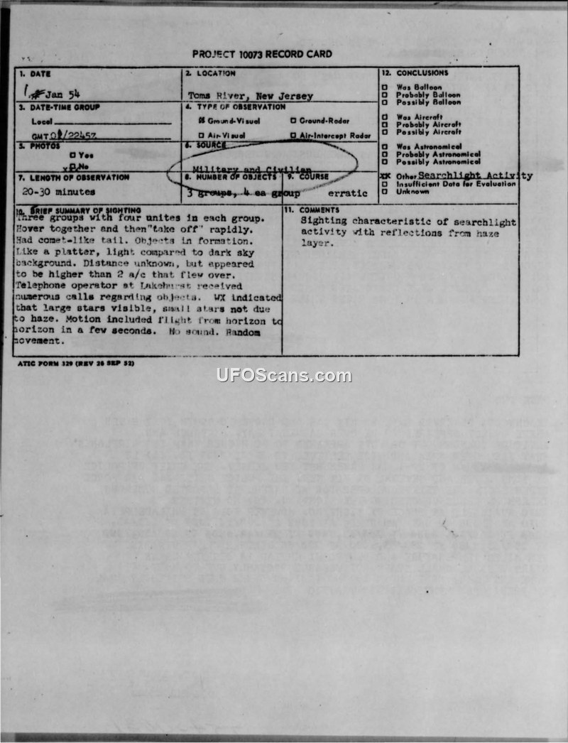 Report to Bluebook on the investigation of Unidentified Aerial Objects in the New Jersey area, night of 1 Jan 54