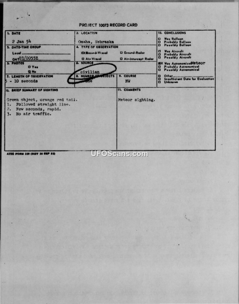 A 1954 sighting report from Offutt AFB describes a green, oval-shaped object with a flame tail. The investigation concluded the object was an exceptionally bright meteor.
