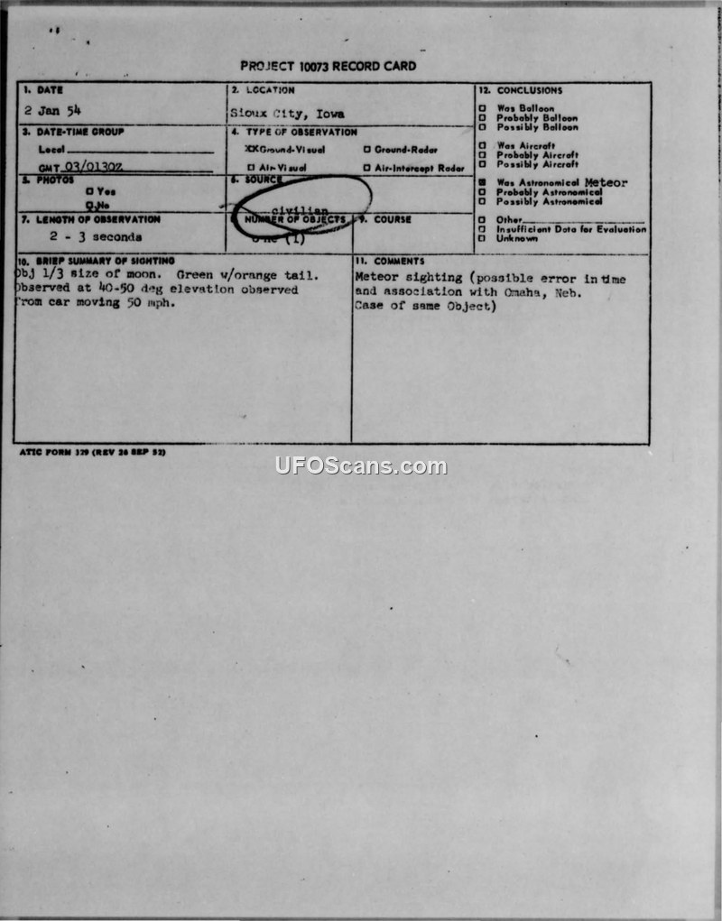 PROJECT 10073 RECORD CARD — Sioux City, Iowa, 2 January 1954