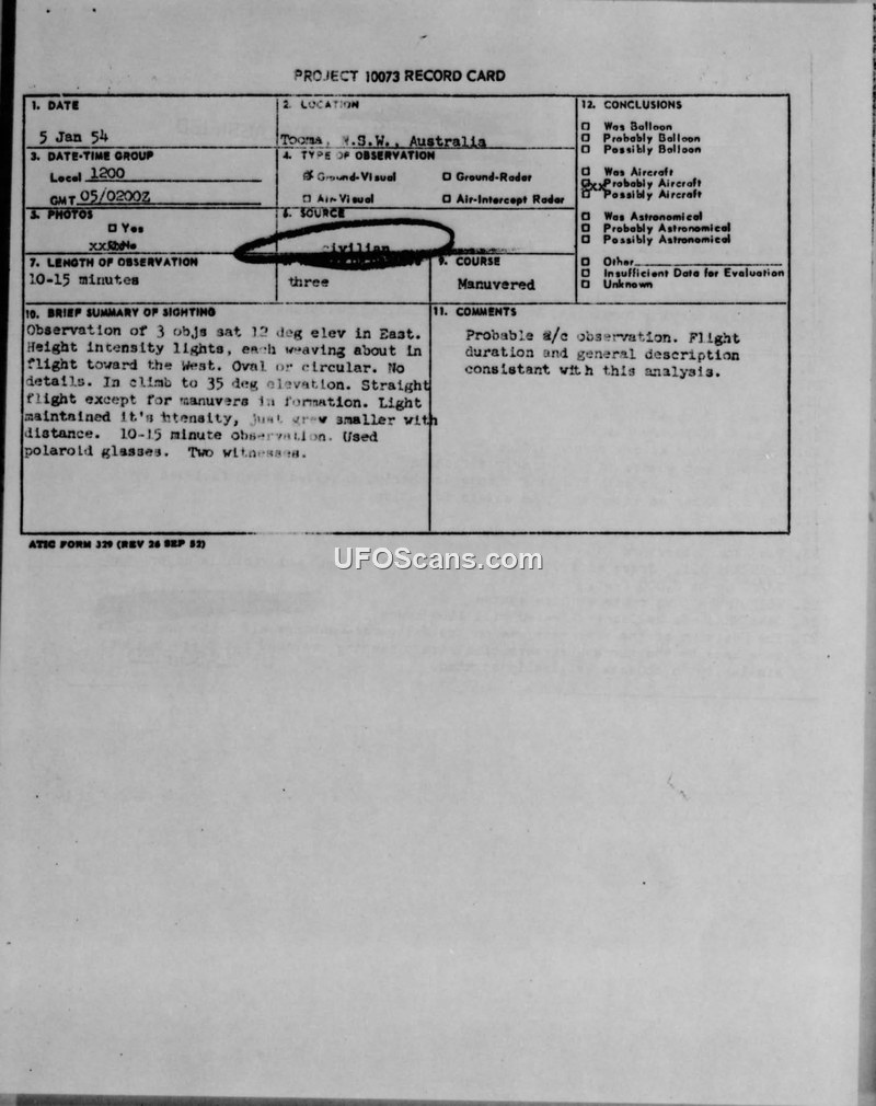Project 10073 Record Card: Sighting of Unusual Aerial Object, Tooma, N.S.W., 5 January 1954
