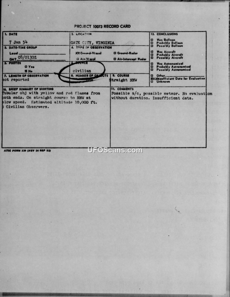 A report of a tubular object with flames seen by five civilians in Gate City, Virginia, on January 7, 1954. The investigation concluded there was insufficient data to identify the object.