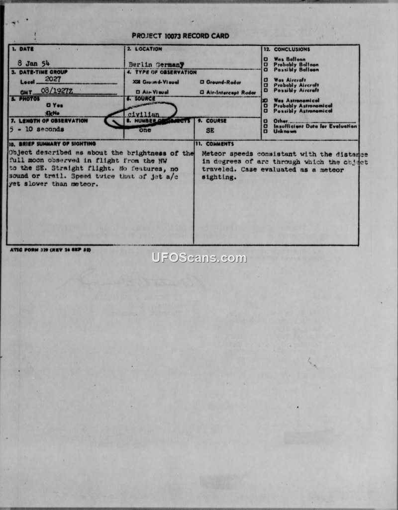 Project 10073 Record Card — Berlin, Germany, 8 January 1954