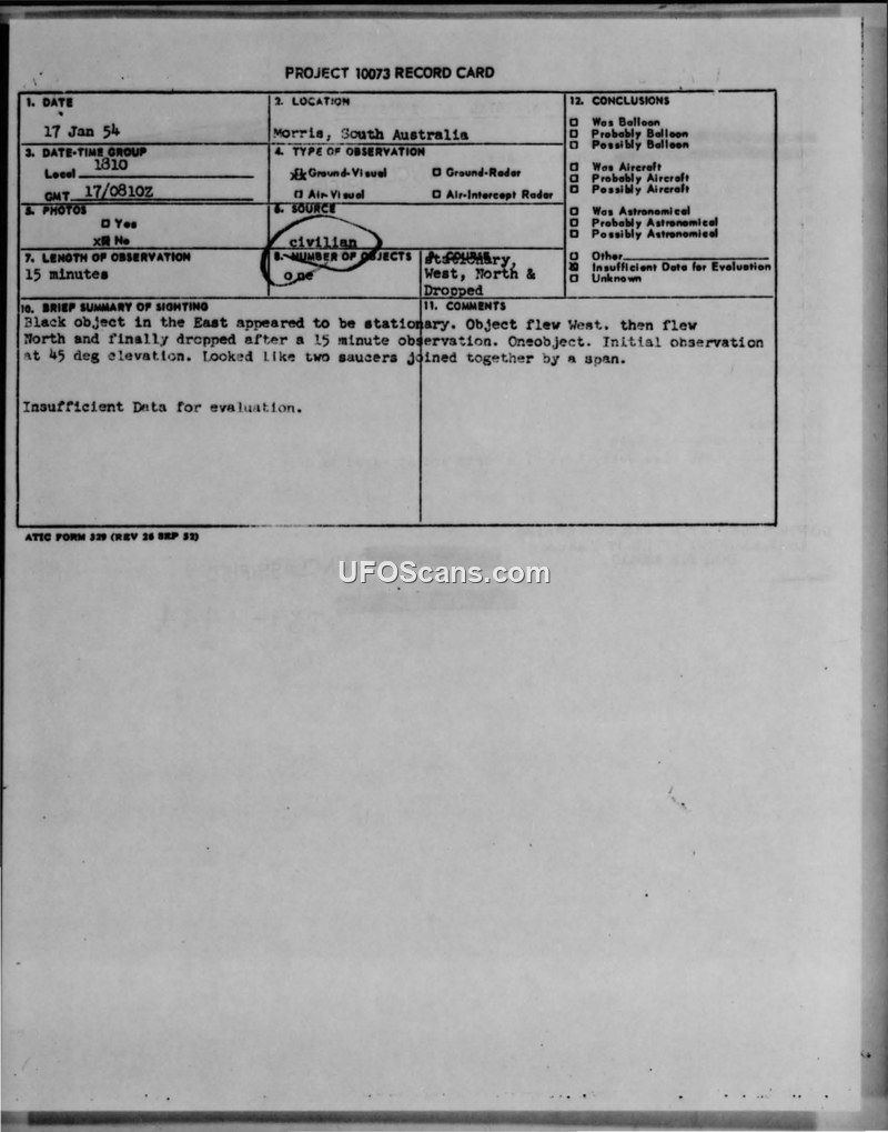 A 1954 sighting report from Morris, South Australia, describes a black, two-saucer-shaped object observed for 15 minutes. The official conclusion for the incident is 'insufficient data for evaluation'.
