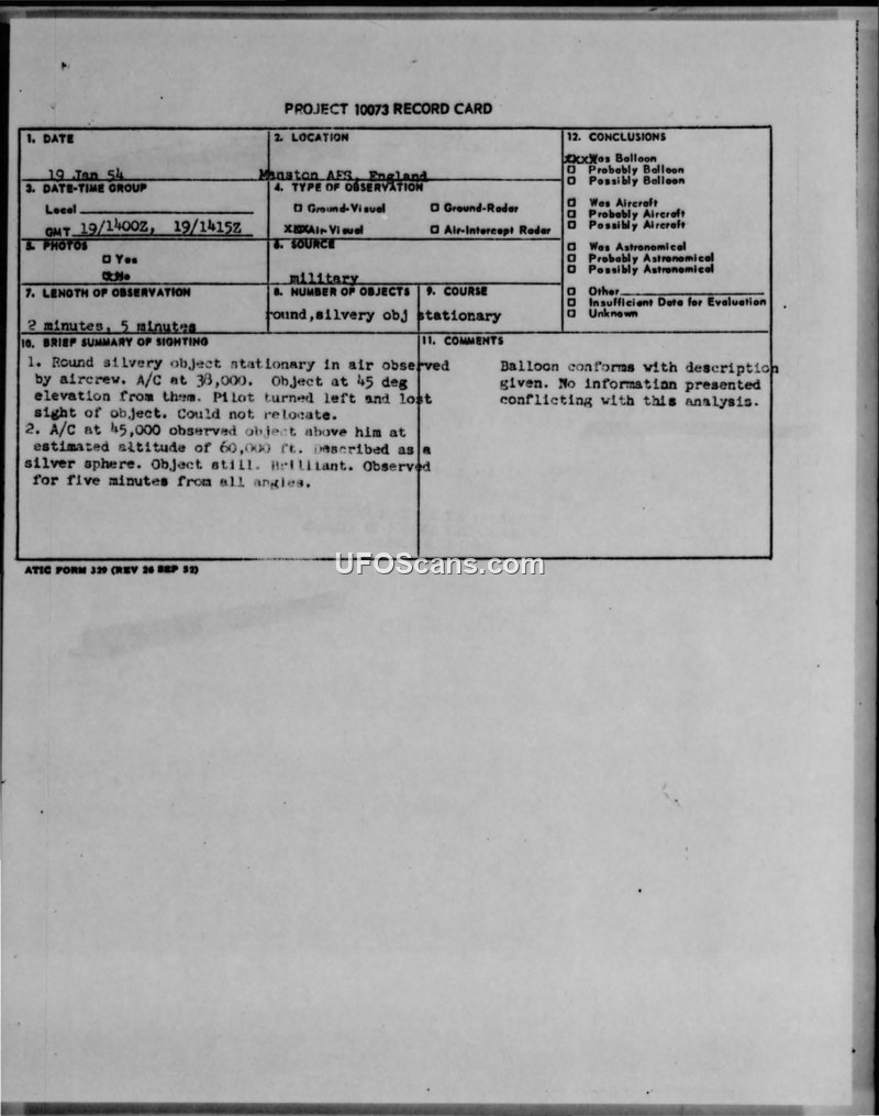 Project 10073 Record Card — Manston, England, 19 January 1954