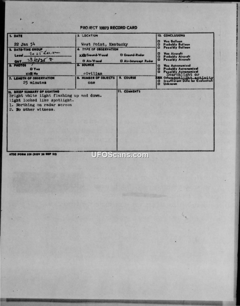 A civilian sighting of a bright white light in West Point, Kentucky, on January 22, 1954, was investigated by the Air Technical Intelligence Center. The phenomenon was officially attributed to searchlight or spotlight activity after radar checks yielded no unusual results.