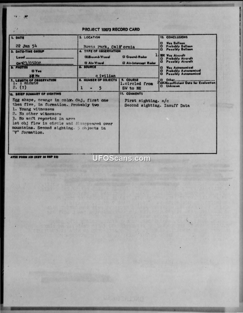 A 1954 report details a sighting of egg-shaped objects in Buena Park, California. Military investigators concluded there was insufficient data to evaluate the incident.