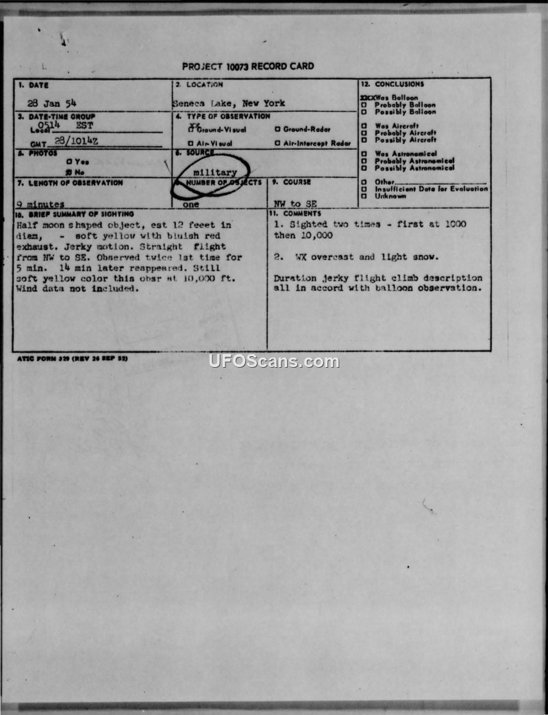 Project 10073 Record Card and Teletype Report — Seneca Lake, New York, 28 January 1954