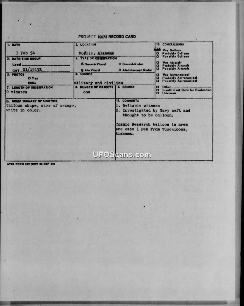 This document is a Project 10073 record card and associated teletype report regarding a February 1, 1954, sighting of an object in Mobile, Alabama. The object was officially identified as a cosmic research balloon.