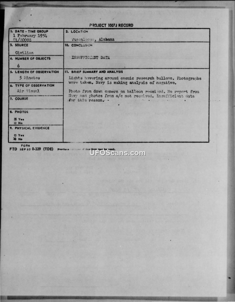 A commercial pilot reported six objects hovering near a cosmic research balloon in Alabama on 1 February 1954. Despite photographic evidence being taken, the official investigation concluded there was insufficient data to identify the objects.